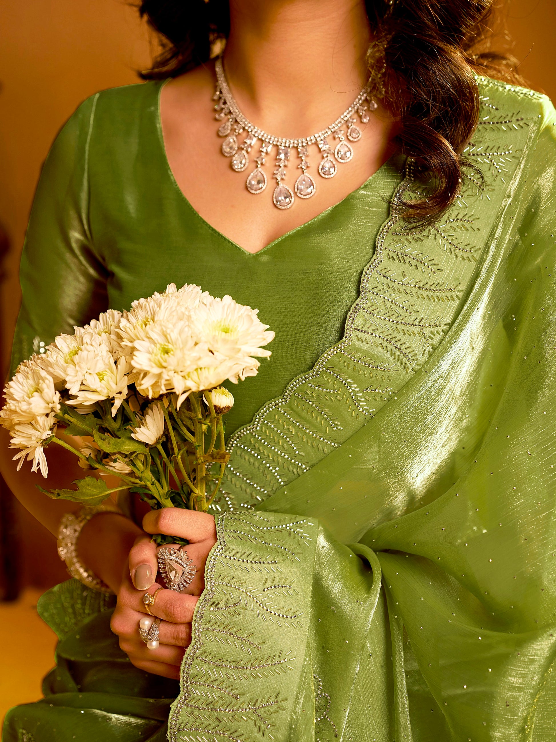 This Stunning Light - Green Saree Exudes Classic Charm with its Soft , Lightweight shinning fabric that drapes effortlessly