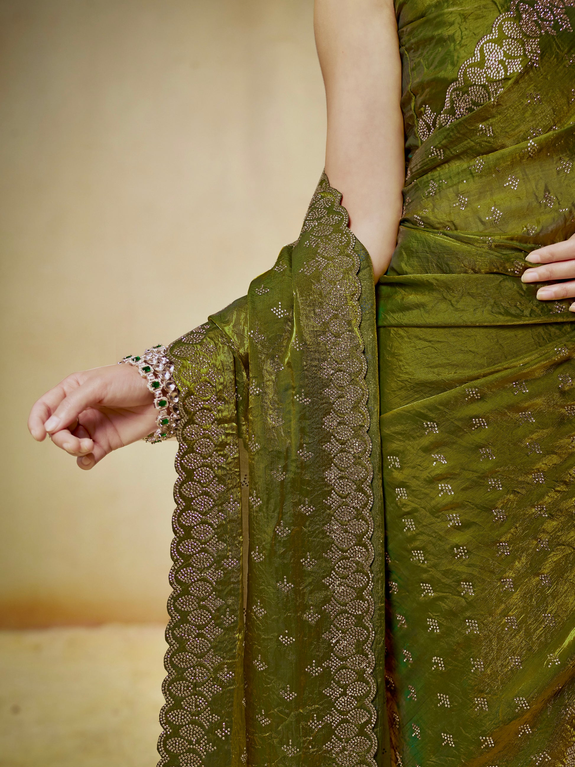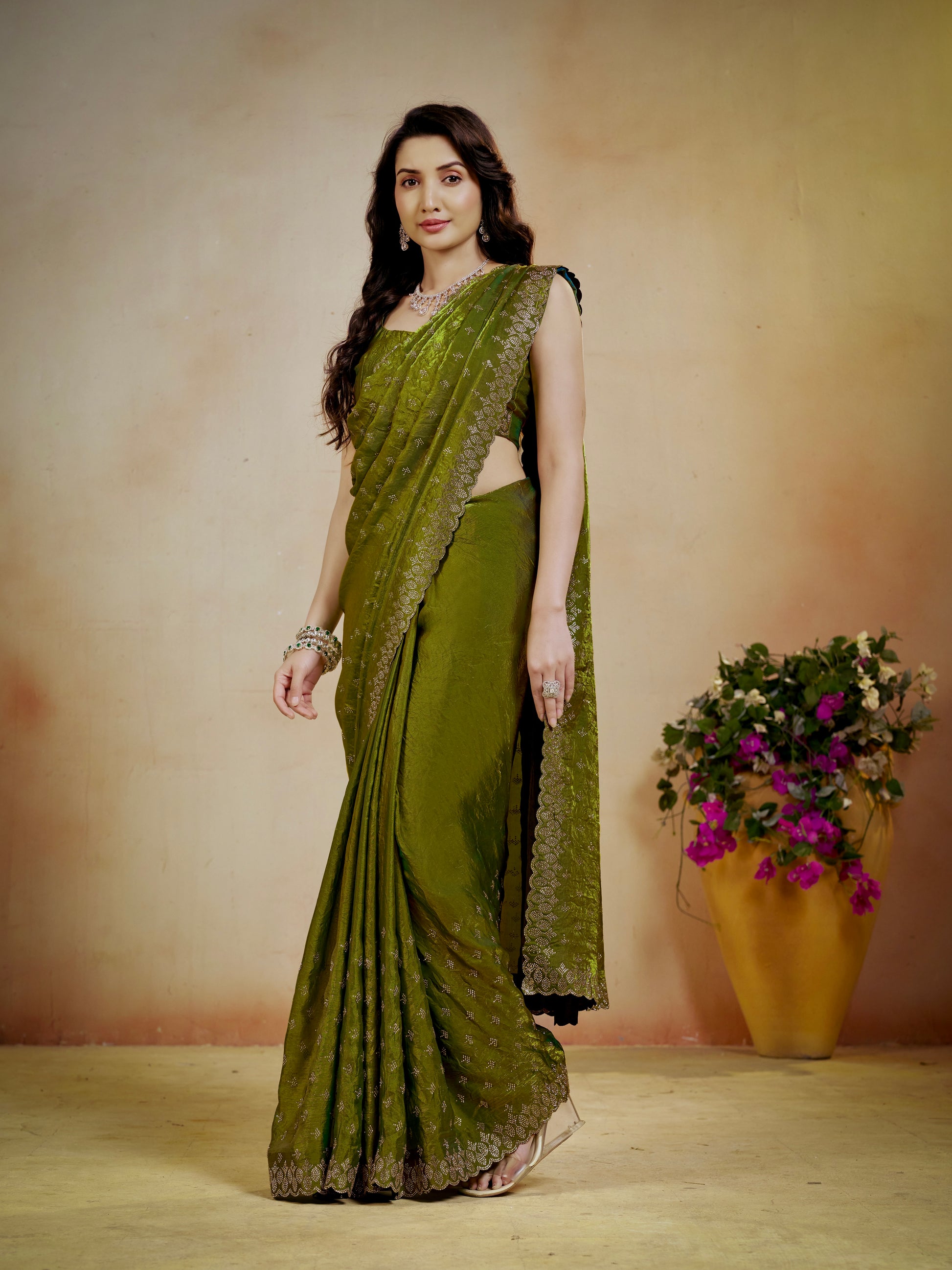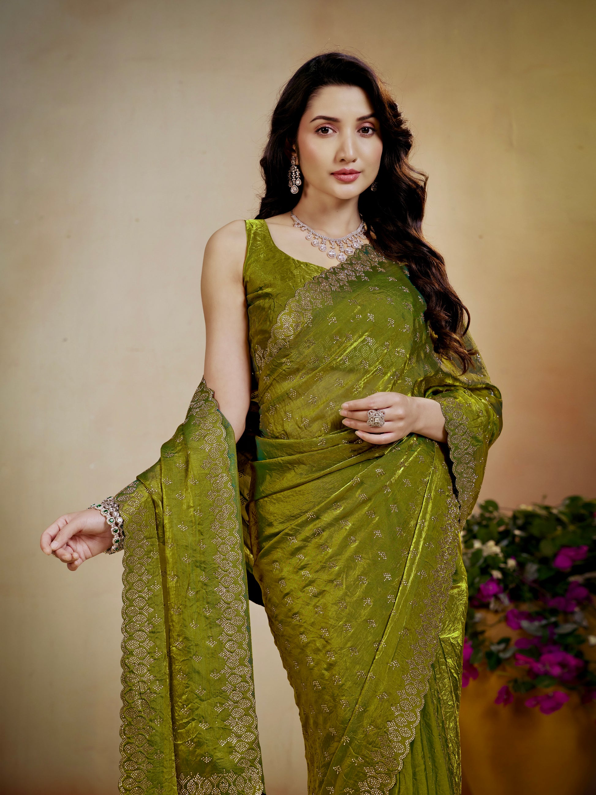 This light olive green saree with a radiant golden sheen is a perfect blend of elegance and royal charm. The soft, lustrous fabric reflects light beautifully, creating a graceful glow with every movement. Intricately adorned with premium golden diamond work inside, the saree showcases fine craftsmanship that adds a luxurious sparkle and rich detailing. Its smooth texture and elegant drape make it ideal for weddings, festive occasions, receptions, and grand evening events. Designed to enhance timeless beauty with a modern touch, this saree is perfect for women who love subtle sophistication with a statement finish.