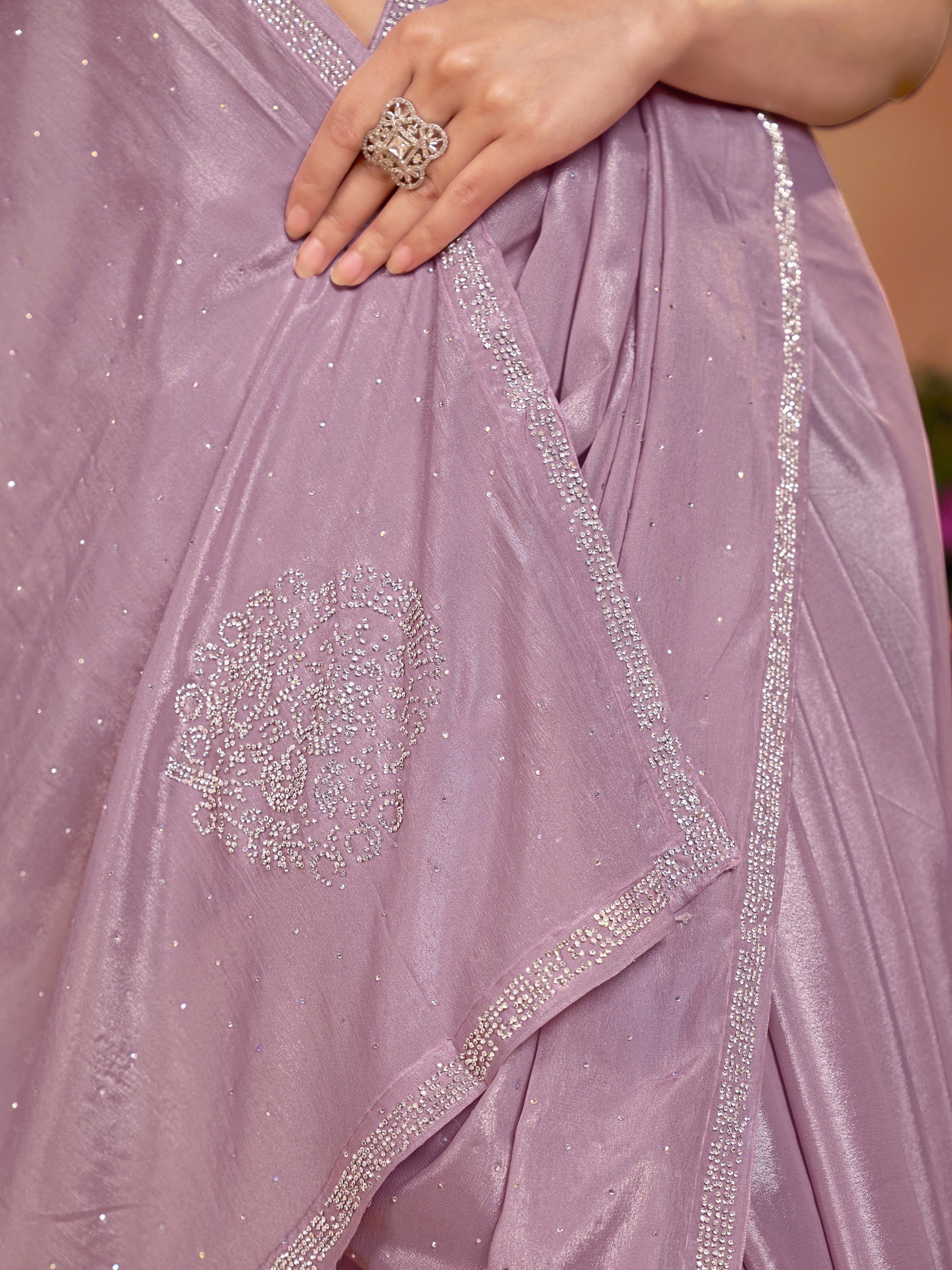 This dusty rose party wear saree is a perfect expression of soft luxury and modern elegance. The soothing blush-toned fabric flows beautifully, creating a graceful and flattering drape. Intricately embellished with premium zarkan work inside, it adds a sparkling touch that enhances the saree’s rich appeal without overpowering its subtle charm. The fine craftsmanship and delicate detailing make this saree ideal for cocktail parties, festive gatherings, receptions, and evening celebrations. Lightweight yet glamorous, this saree is designed for women who love classy sophistication with a hint of shimmer.